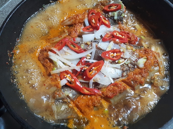 6. 양념장을 가자미나 주변으로 올려준 후 센불로 끓여줍니다.