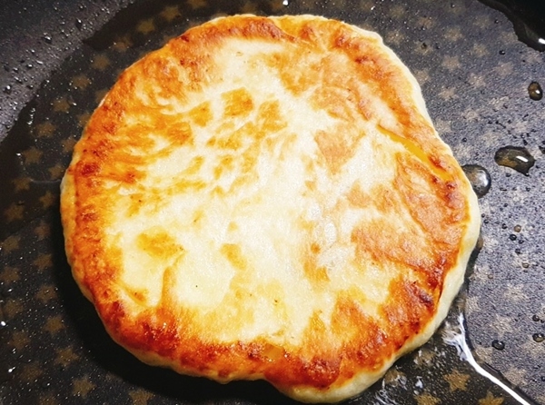 10. 뒤집개나 국자 등으로 호떡을 납작하게 만들어준다. 너무 얇게 만들어주면 호떡 속 꿀시럽이 밖으로 흘러나와 팬을 더럽힐 수 있습니다.