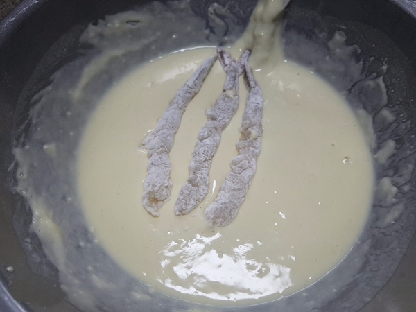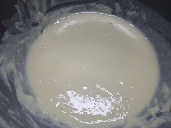 밀가루 반죽의 점도는 숟가락으로 떨어뜨렸을 때 주르륵 흐르지 않고 반죽이 숟가락에 묻어있을 정도가 좋습니다. 만약 반죽이 뻑뻑하면 물을 조금 더 넣어 약간만 묽게 만듭니다.