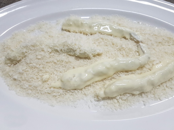 10. 새우에 반죽을 묻히고 빵가루를 입혀 팬에 넣어줍니다.