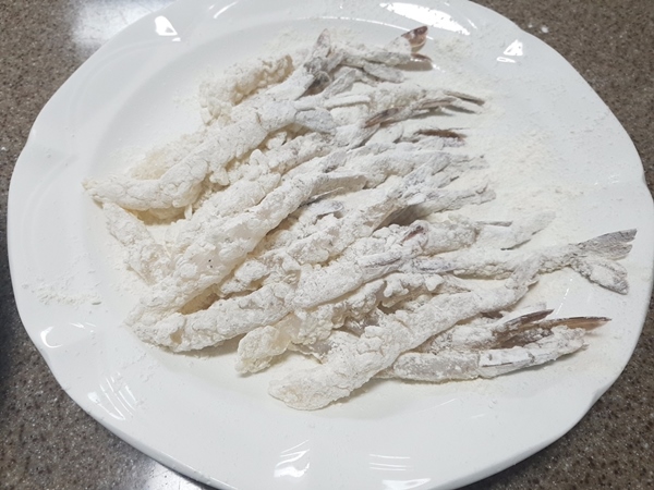 8. 간이 된 새우에 밀가루를 묻힙니다.