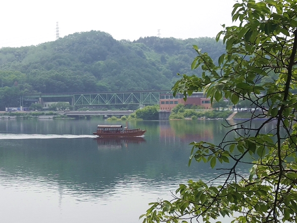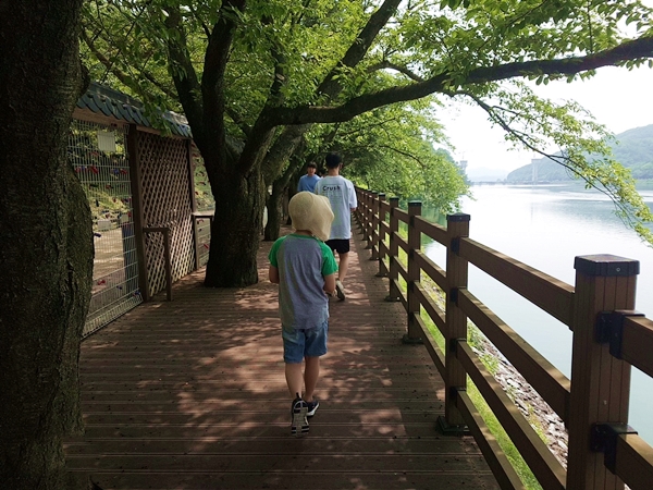 아이들이 산길을 산책하고 싶다고 하여 오른쪽으로 방향을 돌려 숲길을 걸었습니다. 10분쯤 걸었을까 아이들이 시원한 음료를 먹고 싶다고 하여 발을 돌렸는데 강물을 따라 배 한척이 지나갔고 하늘에는 새가 줄지어 가는 풍경을 보니 너무 한결 편안해졌습니다.
