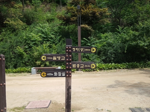 두 아이와 월영교를 지나는데 목교여서인지 약간의 흔들림을 느꼈습니다. 작은 아이는 다리가 흔들린다며 무서워하였지만 난간으로 가 서 있을 때 잠깐 흔들렸습니다. 그리고는 다시 가던 길을 마저 갔습니다. 월영교 맞은 편에 다다랐을 때 이정표가 나왔습니다.