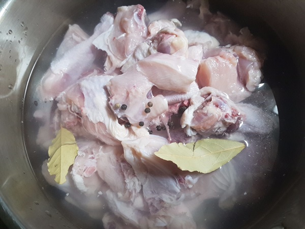 7. 냄비에 닭과 월계수 잎, 통후추를 넣어 살짝 데쳐줍니다.