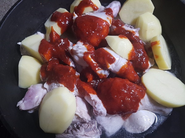 9. 감자와 당근, 양념장 1/2을 넣어 닭과 함께 센불에서 끓입니다.