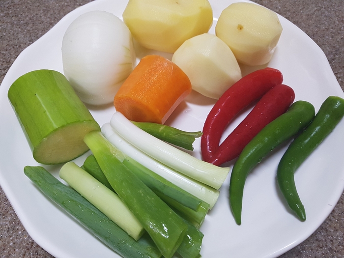 닭고기 1kg, 양파 1/2개, 감자(중) 2개, 당근, 대파, 페페로치노 5개, 홍고추 2개, 풋고추 2개, 우유, 월계수 잎, 통후추, 참기름, 통깨