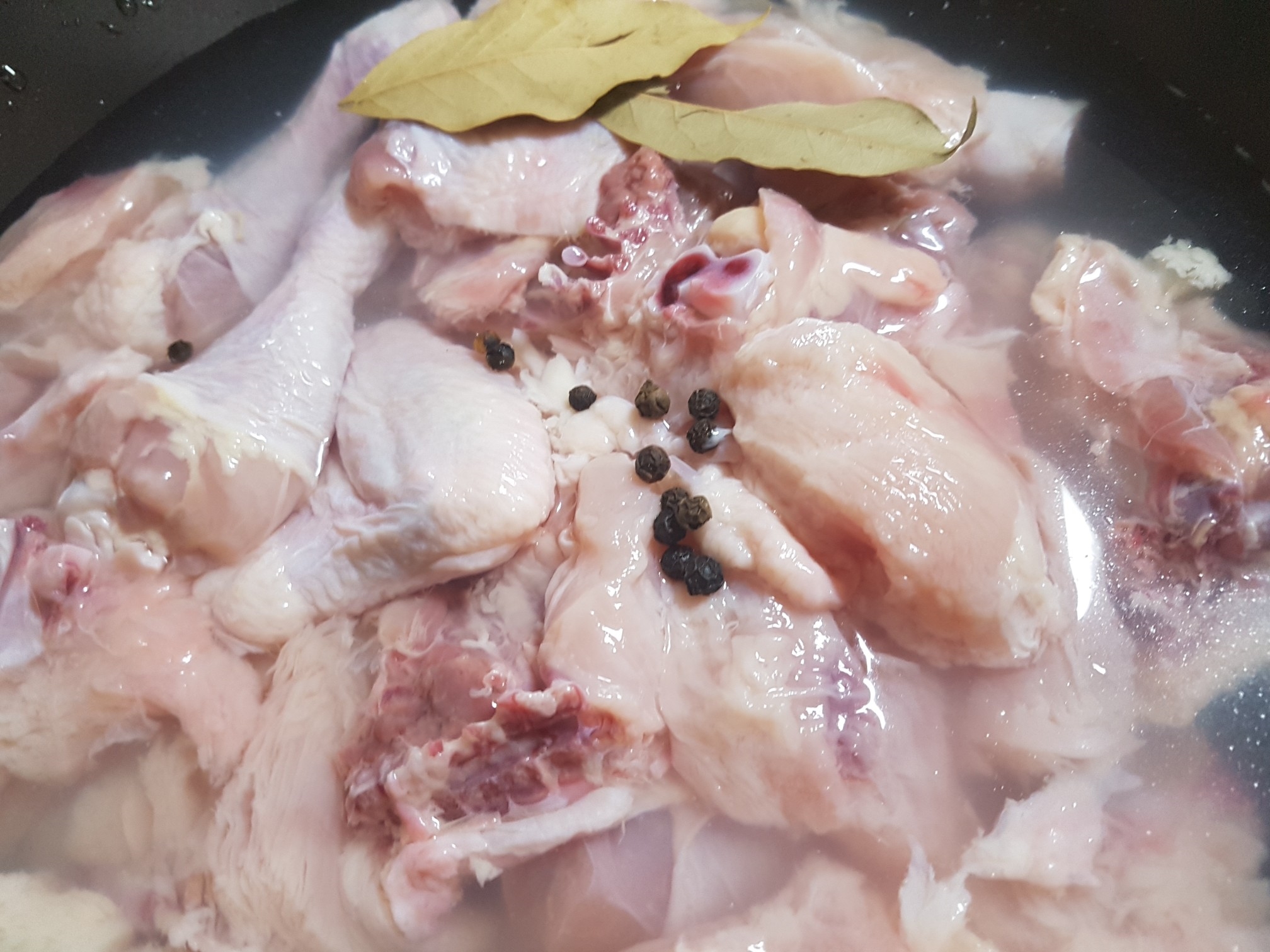 4. 월계수잎 2장, 통후추 5개, 물을 부어준 후 한번 팔팔 끓입니다.