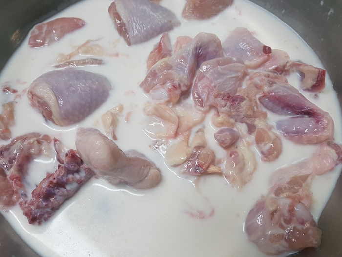 2. 닭고기를 우유에 30분정도 담가둡니다.