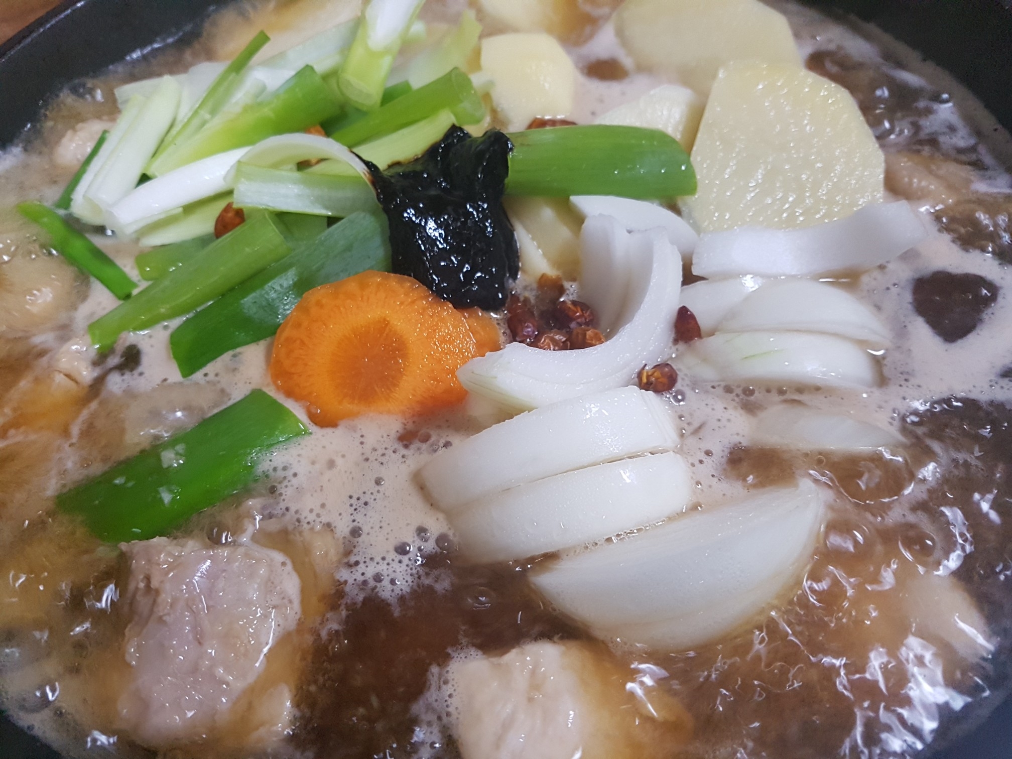 8. 물이 끓으면 감자, 당근, 대파, 건고추, 춘장 1T를 넣고 더 끓여줍니다.