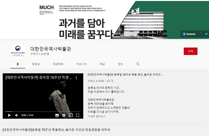 유튜브 박물관 중에 대한민국 역사박물관의 콘텐츠를 소개하겠습니다. 역사박물관에 가서 직접 역사자료들을 보지는 못하지만 우리가 알지 못했던 숨어있는 독립운동가, 40주년 된 5·18광주민주화운동의 특별전, 문화행사 등의 콘텐츠를 볼 수 있습니다. 아래 링크는 유튜브의 대한민국역사박물관' 채널입니다.