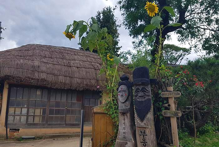 마을 안쪽으로 들어오자 초가지붕으로 둘러싸인 골목길을 지나는데 해바라기가 익어가는지 고개를 숙이고 있었어요. 하지만 아직 해바라기 씨를 빼먹기에는 시간이 좀 걸릴 것 같았습니다. 골목길 귀퉁이에 핀 작은 채송화와 백일홍들이 고택에 생기를 불어넣어주는 것 같아 정겨웠습니다.