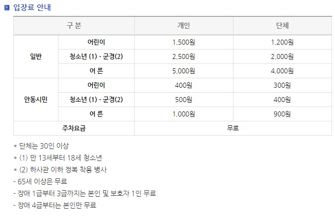 안동하회마을에 들어가려면 매표소에서 표를 구매해야 합니다. 5년 전에는 무료였던 것 같은데 이젠 표를 구매해야 들어갈 수 있네요. 유료로 하회마을을 잘 지키고 보다 나은 관광지로 만들려면 입장료를 내는 것도 괜찮습니다. 아래 입장료가 자세히 나와있습니다.