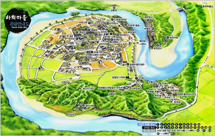 안동 하회마을 주변으로 낙동강이 큰 S 자 모양으로 휘돌아 흐르기 때문에 하회(河回)라 지었습니다. 하회마을에서 600여년 된 느티나무가 있는 곳이 마을에서 가장 높은 중심부에 해당하고 그 중심으로 강을 향해 배치되어 있으며 이미 조선시대부터 사람이 살기에 가장 좋은 곳으로도 유명합니다.